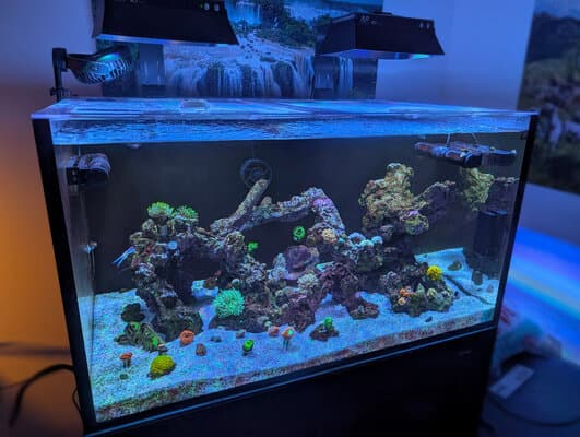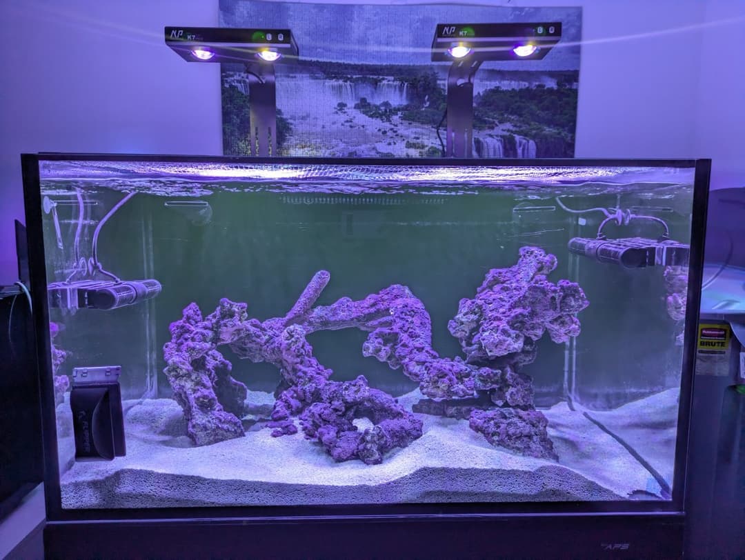 I bought a PAR meter and dialed my lights to about 100 PAR on the sand bed and 200–250 on the highest rock. I’m slowly ramping up now.