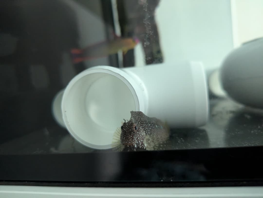 I was freaking out and had no idea what was wrong. I did a 60% water change in case something was off, but that didn't help. Then I thought maybe gill flukes were involved, so I gave him a 4-5 minute FW bath (he handled it surprisingly well), but that didn't help either. Still gasping at the surface. Exhausted at 3am, not knowing how to help him, I shut off all the ambient light in the house and went to bed, expecting to find him gone in the morning... Well, I wake up and he's totally fine! Just chilling in his PVC pipe. Thanks Sushi, for giving me such heart attacks.