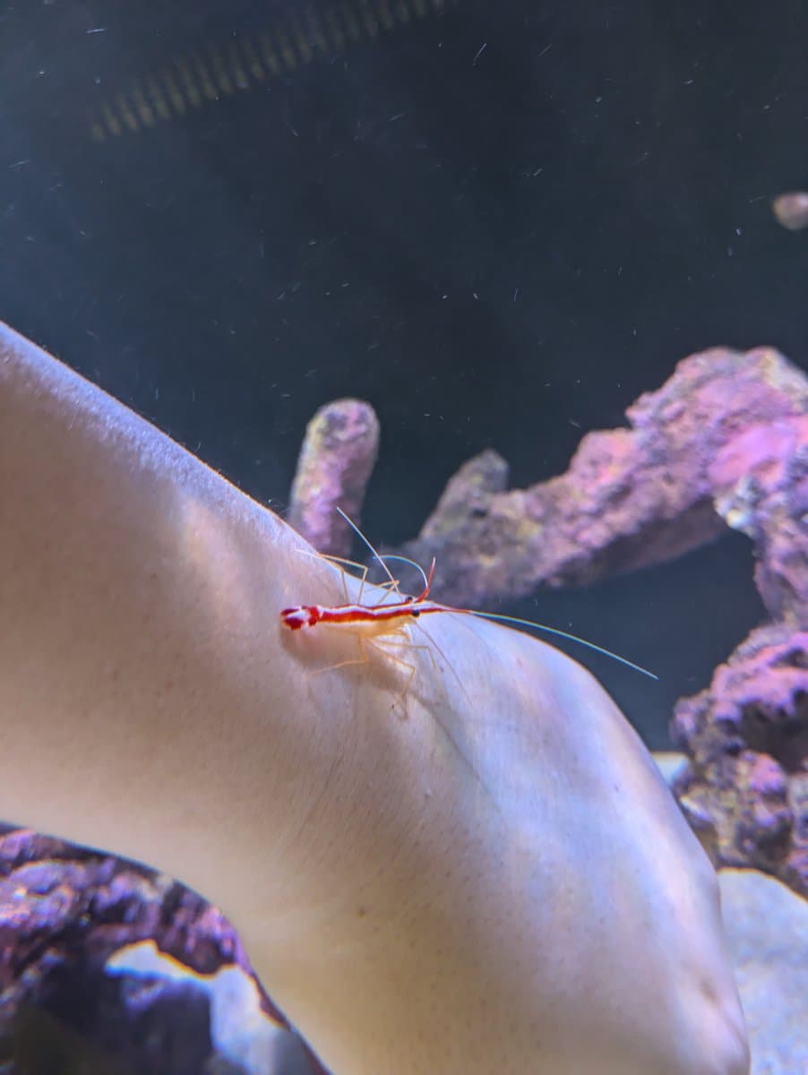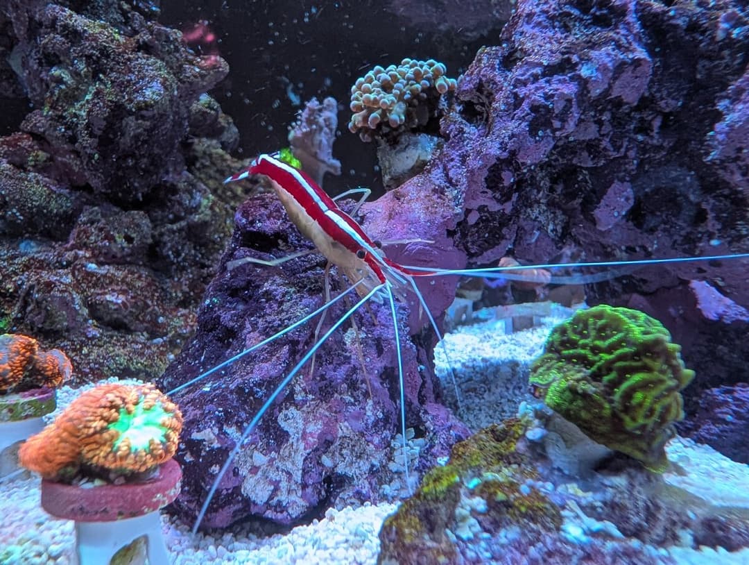 My blood red fire shrimp usually stays in a cave where it sets up a cleaning station, so the fish can come to them. But my two skunks seem much more active, crawl all over the tank and actually try to jump at my fish to clean them. My tilefish don't really sleep, they swim/hover around the bottom, so I think they can panic when the shrimp suddenly touch them in almost complete darkness, ugh.