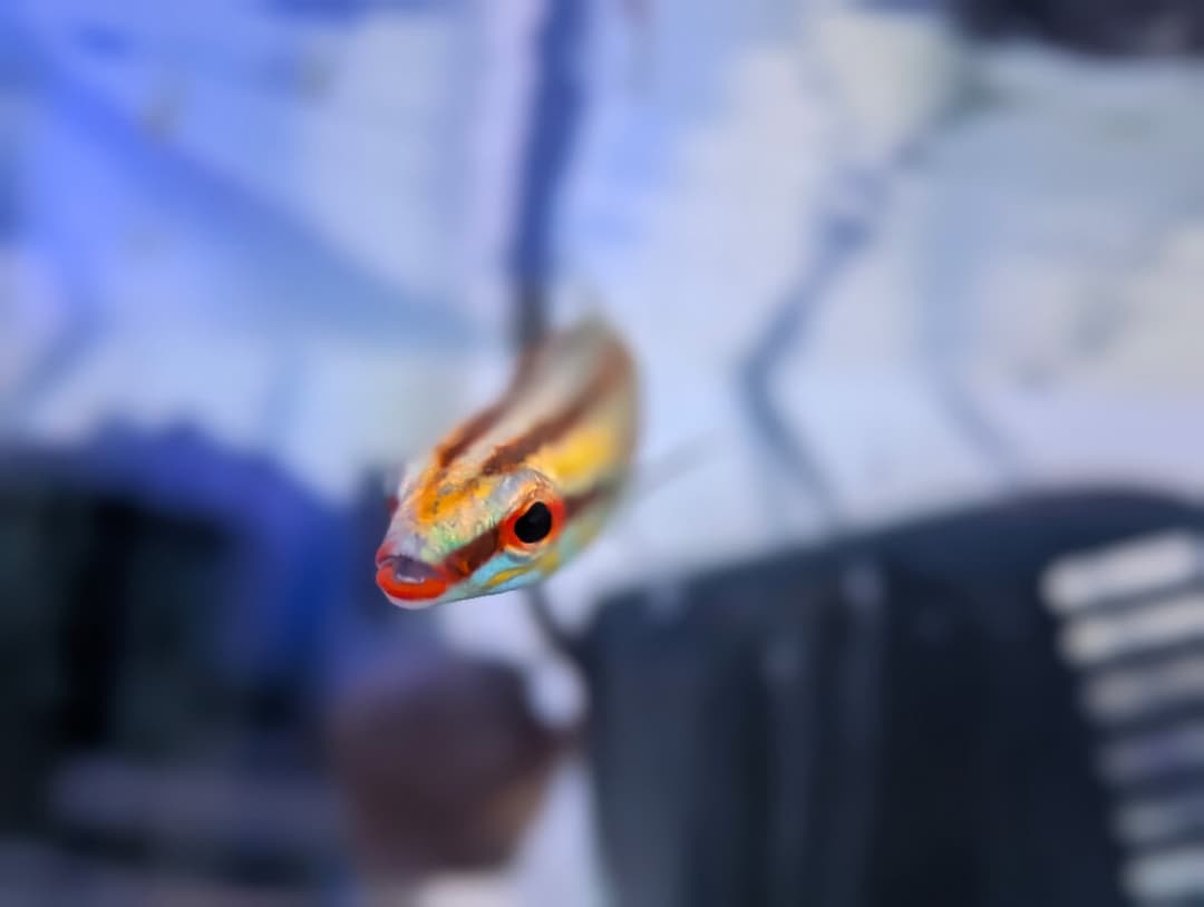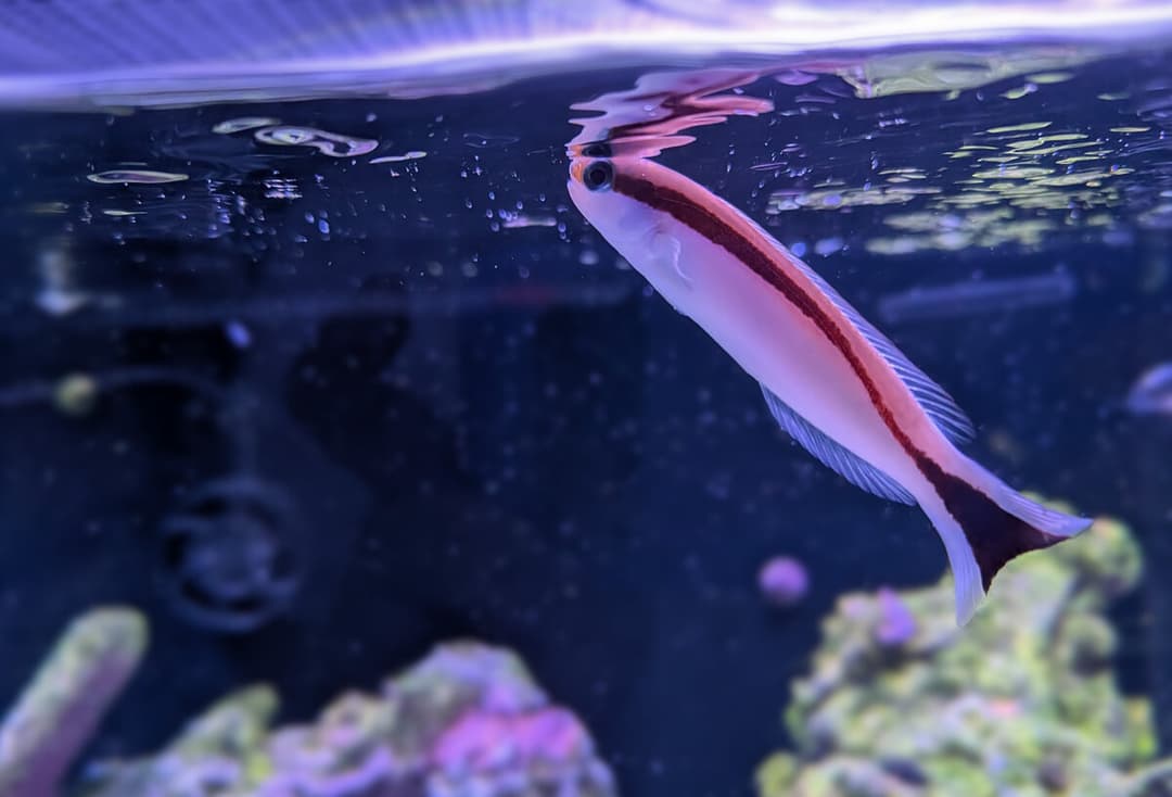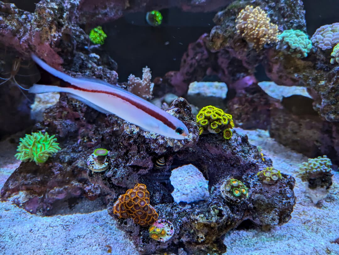 I also got two other fish a while back - yellow and purple wrasse, as well as a fish marked as 'Deep Water Hogfish' that turned out to be a Terelabrus wrasse (not 100% sure on the exact species). Both went through QT without issues, and the Terelabrus wrasse is honestly such a great curious fish. It's very similar in personality to Sushi. I've not seen it available since, but if you do, buy it! It's always cruising the tank looking for food, often teaming up with the yellow and purple wrasse, always out in the open, curious. Sleeps under my rockwork at night.